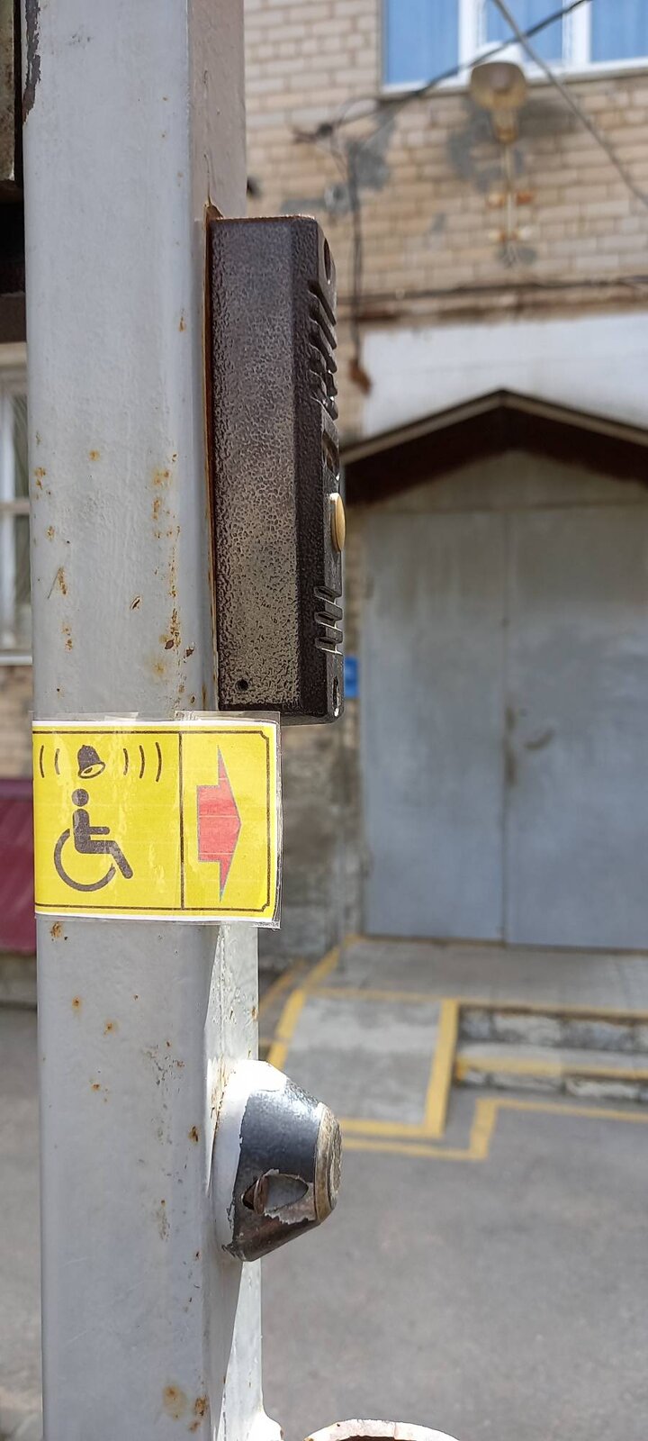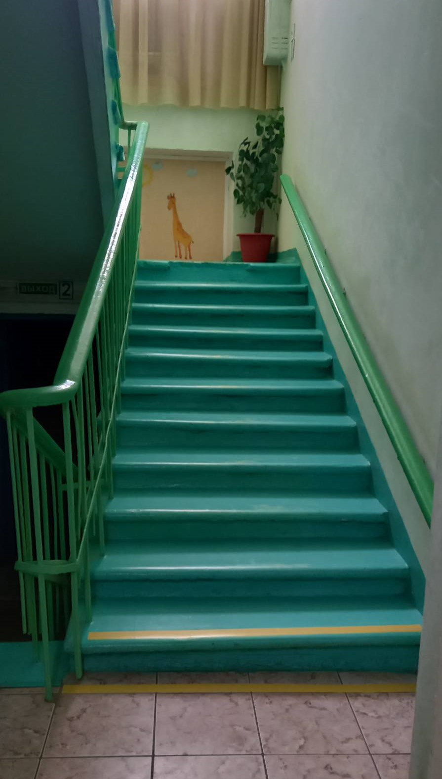 - Ступеньки к зданию и внутри здания, входные двери оснащены цветовыми полосками и кругами.
